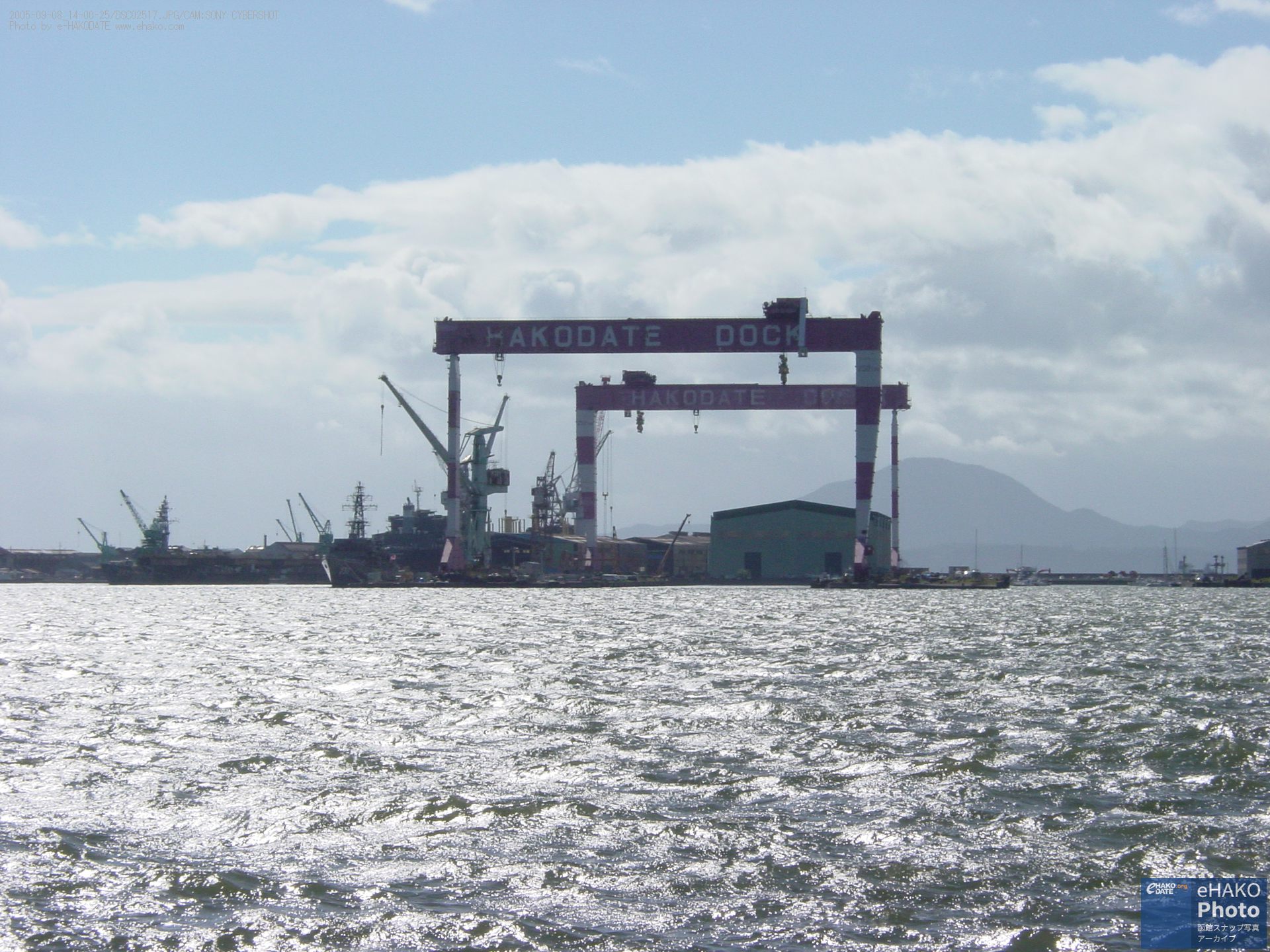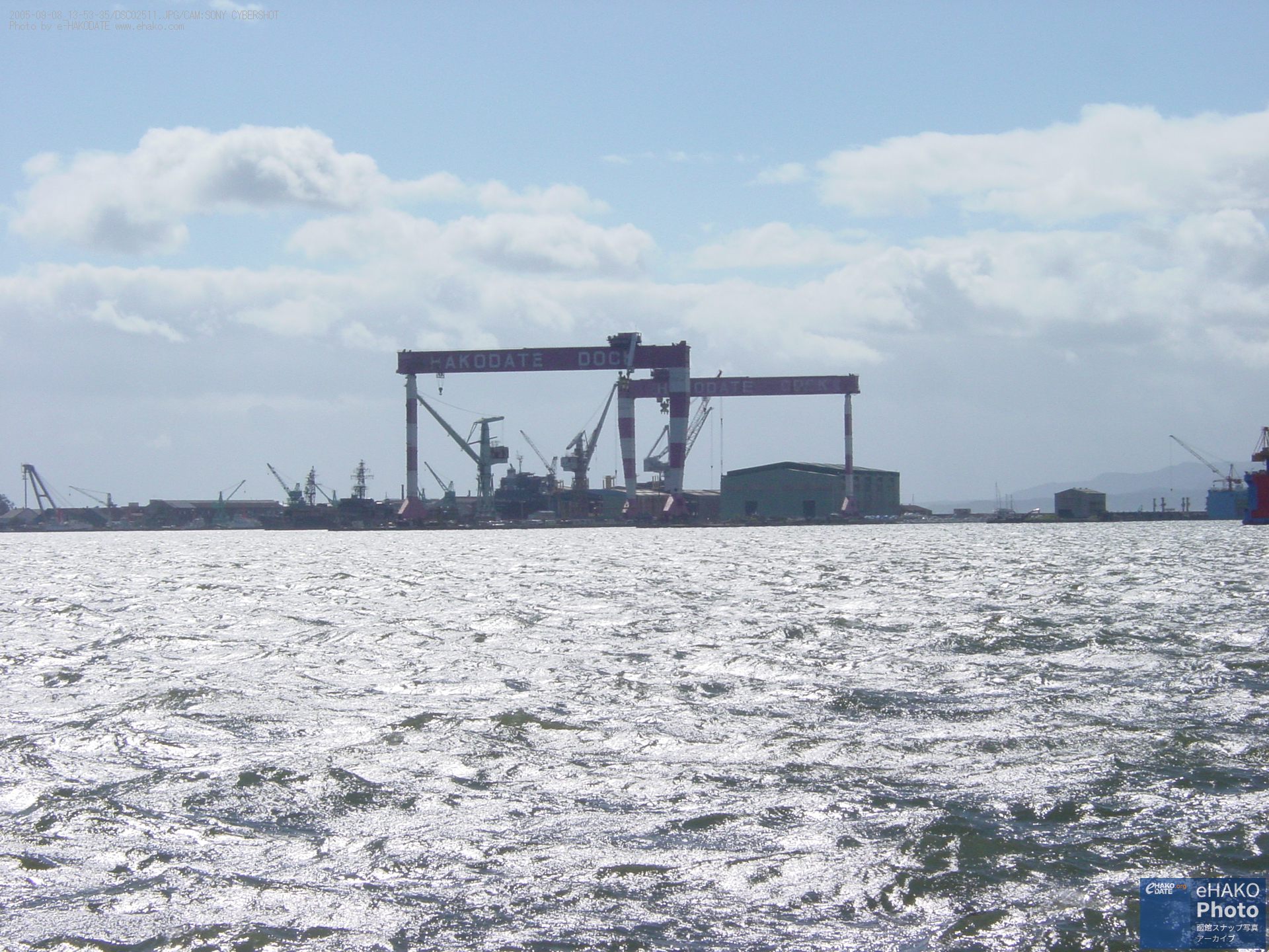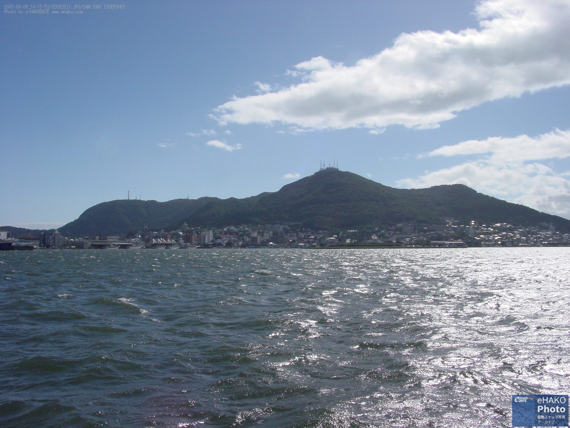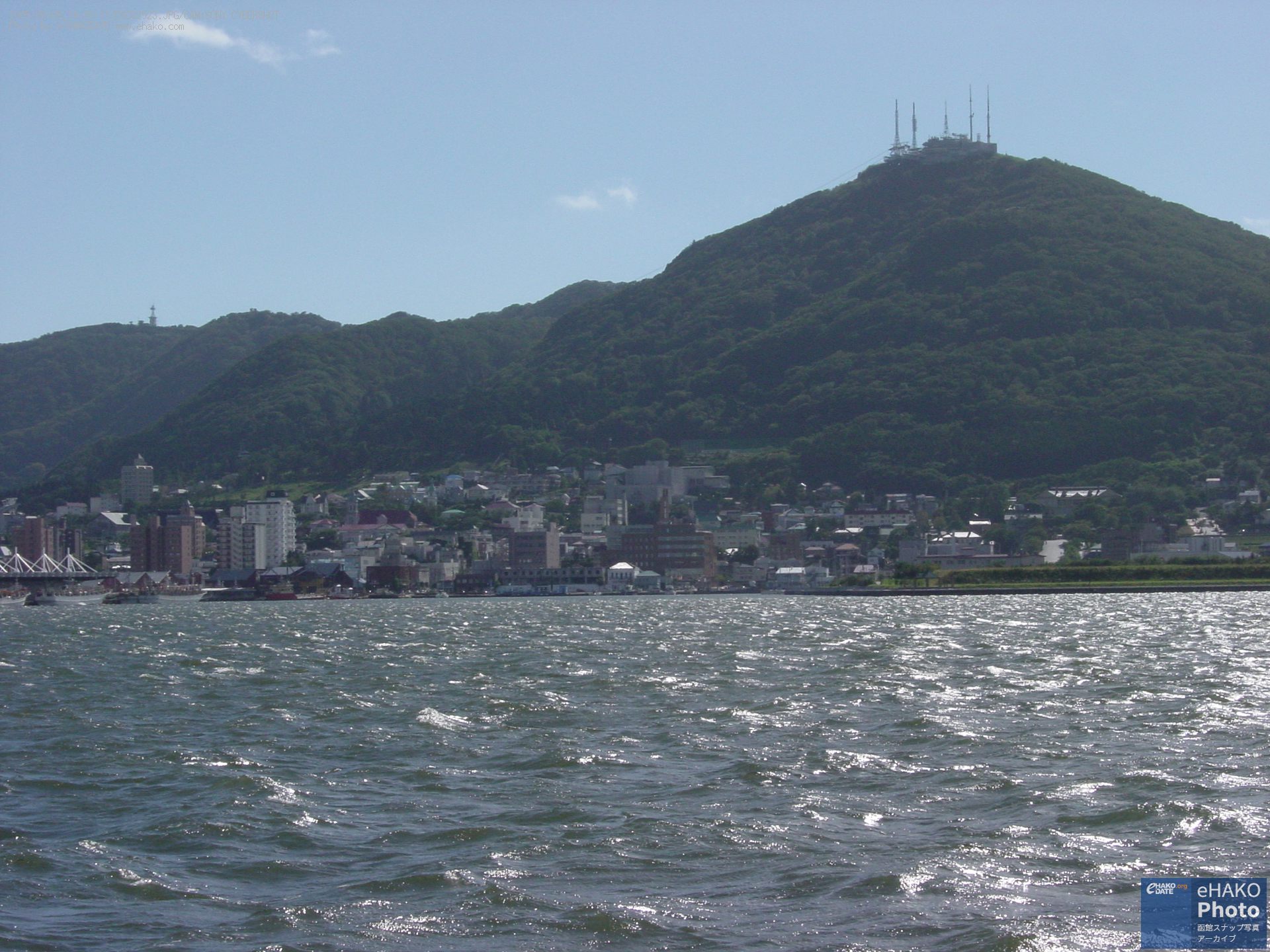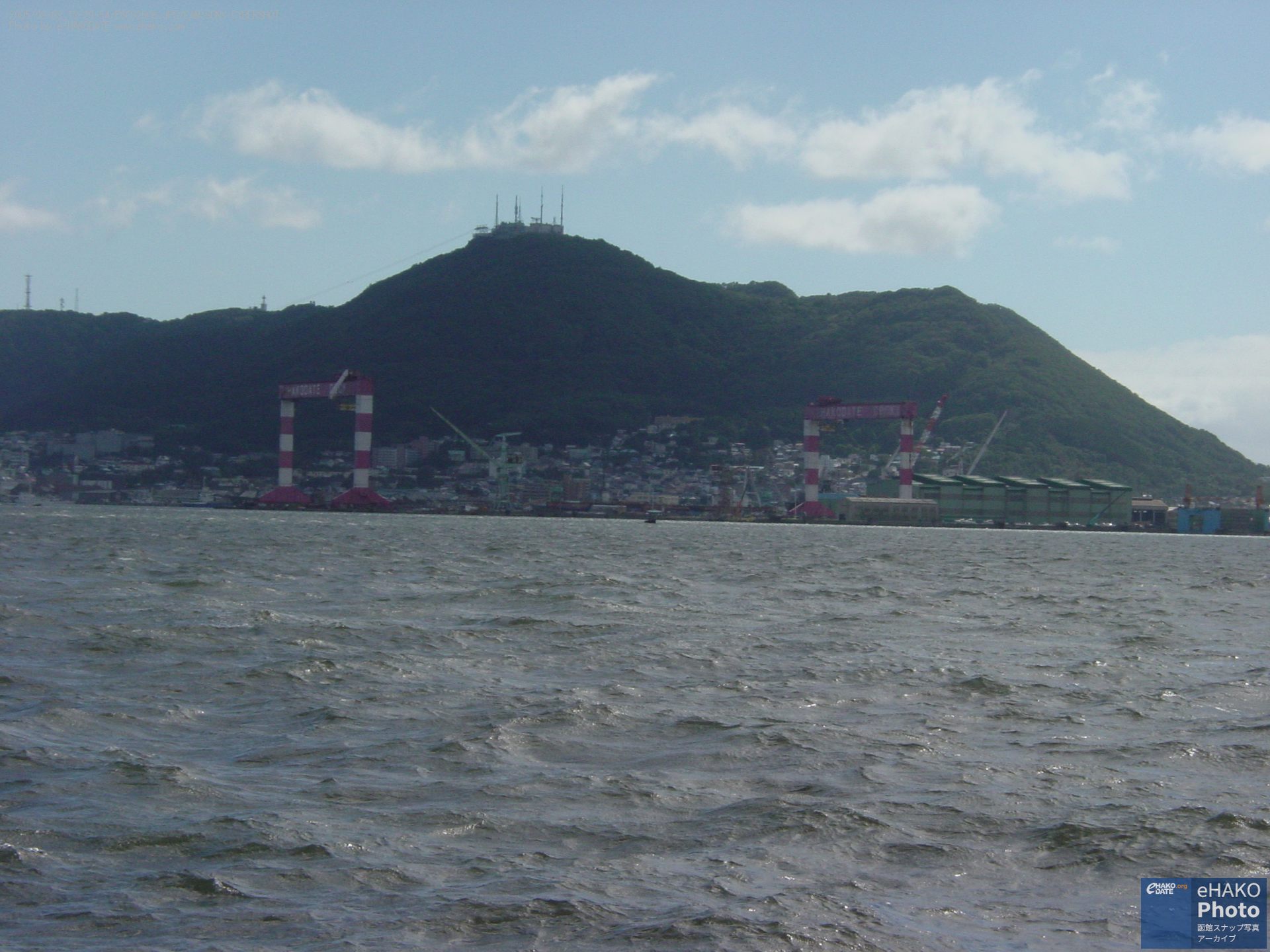 埠頭から函館湾と函館山を眺める 2005年9月 2005年9月8日13:30頃撮影 万代埠頭の入口付近とか北埠頭あたりからの撮影らしい写真です。風と波が少しありますね。 函館山の方を見ると目に入るあの大きな門型クレーンはもうありません。 FacebookXBlueskyHatenaCopy