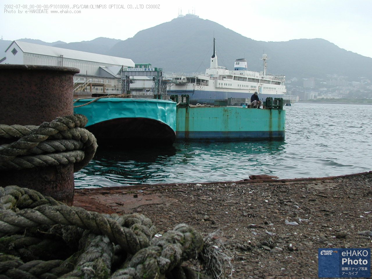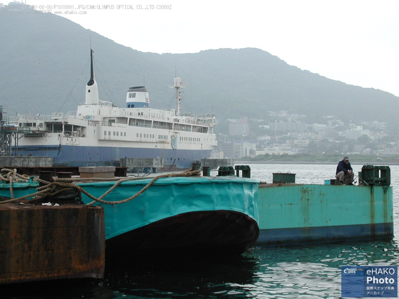 函館駅裏手の岸壁から摩周丸と函館港を臨んで。函館どつくのゴライアスクレーンの姿もまだ健在。