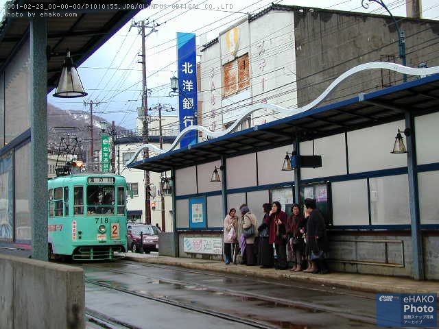 これからお出かけ? 2001年2月28日撮影。 雪から雨に変わって、市電の到着を待つ人々もなんとなく気楽そう。 十字街電亭の裏には、今はなき「ちはる屋」の建物。 FacebookXBlueskyHatenaCopy