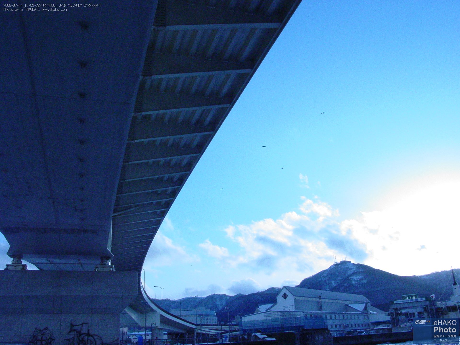 冬空、巴大橋と函館山、旧シーポートプラザ
