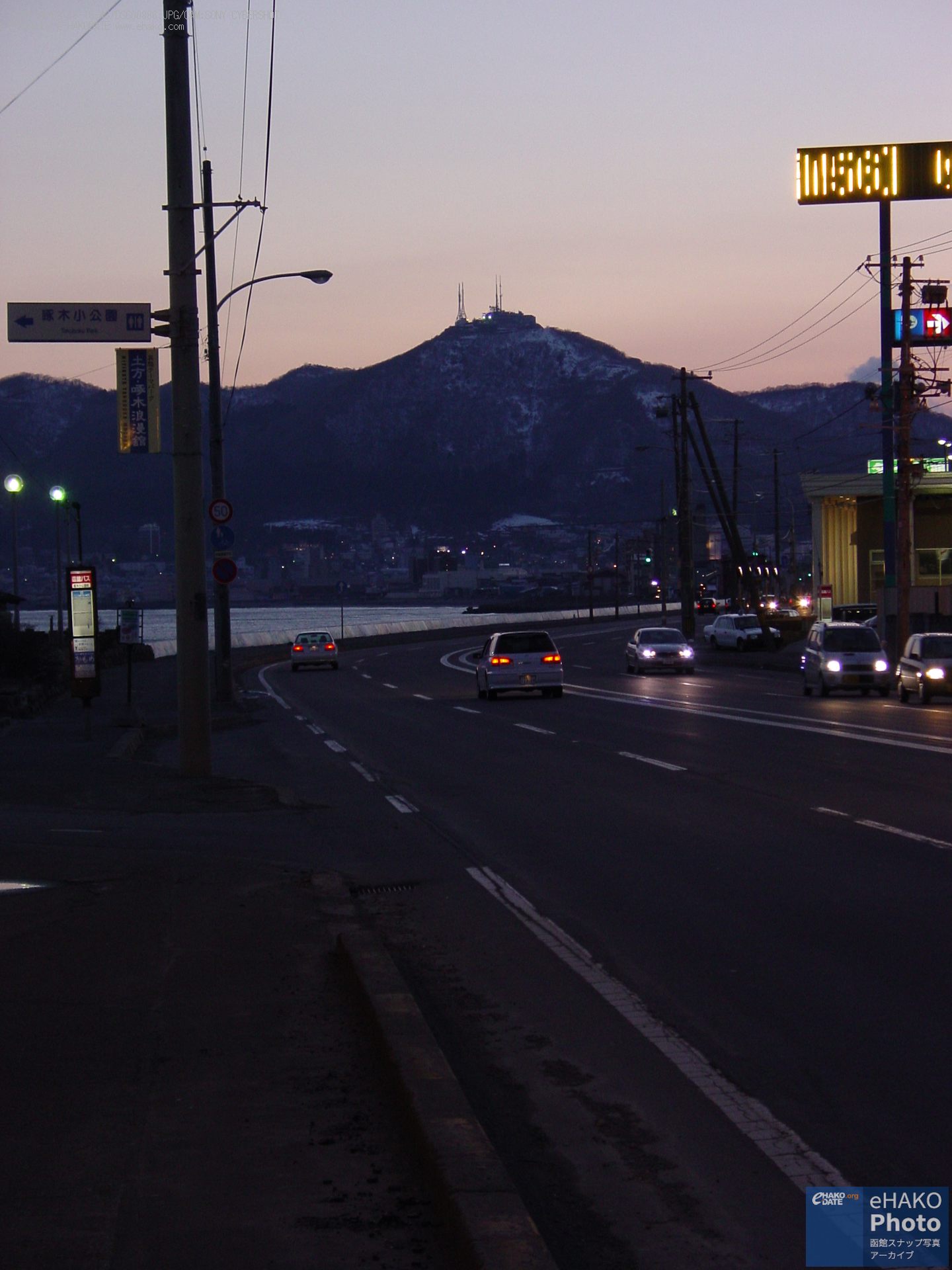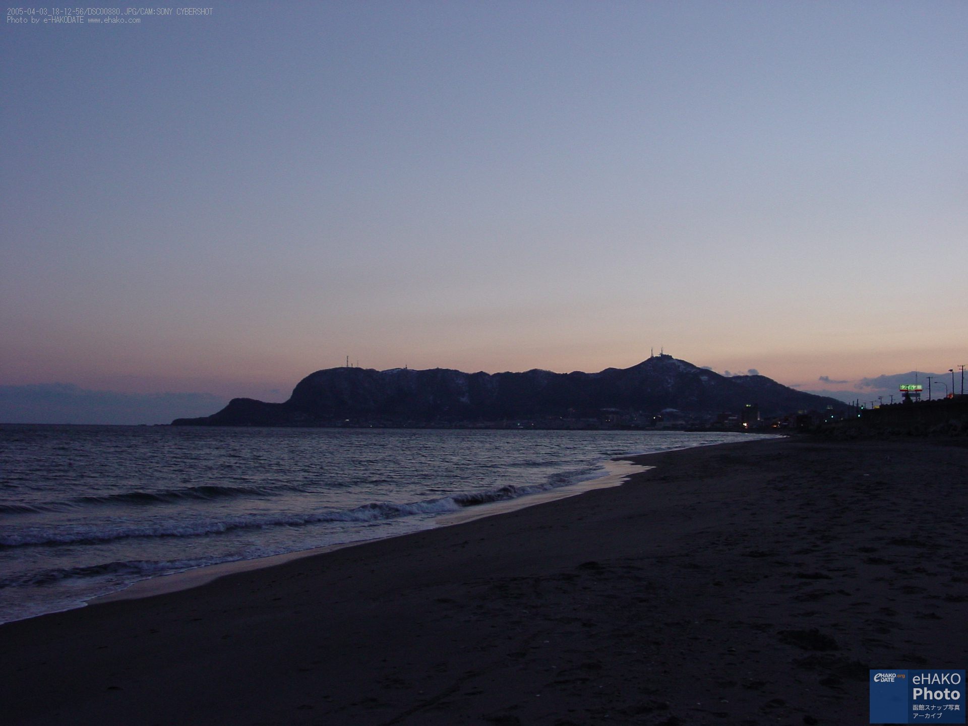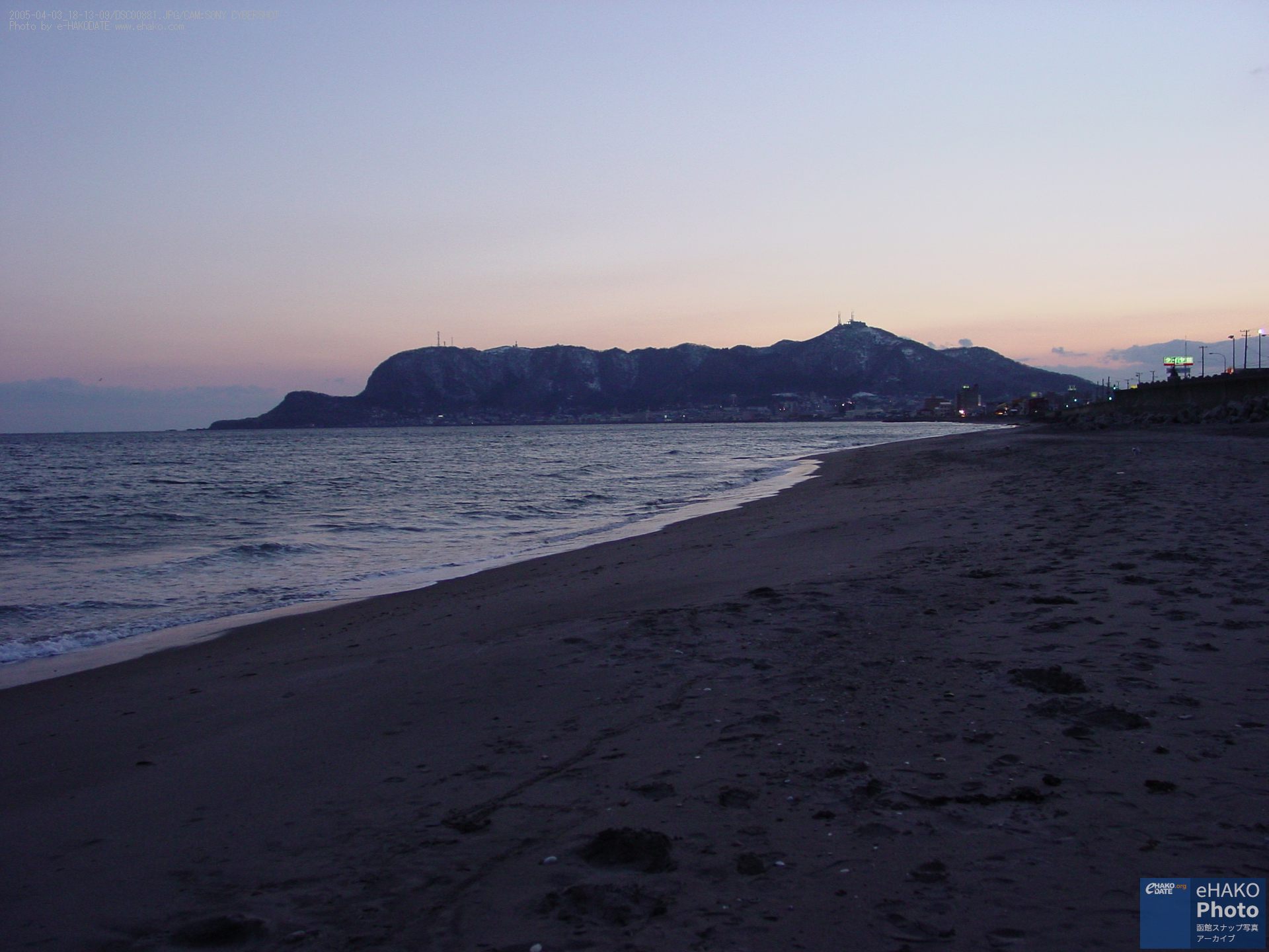 日没直後、春の大森浜 2005年4月3日18:12頃撮影。 春、日没後の大森浜海岸の砂浜です。函館山の後ろに夕暮れのグラデーションが見えて綺麗ですね。場所は啄木小公園のあたりです。 FacebookXBlueskyHatenaCopy