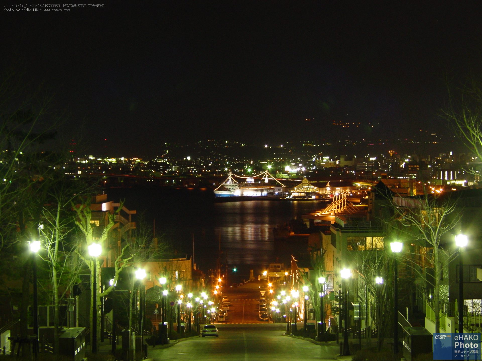 夜の元町 八幡坂 2005年4月14日19:09撮影。 元町の坂といえば定番中の定番、八幡坂からの夜景です。まだ春早い時期なので木々には葉がありませんが、この時間帯なら街の灯かりも摩周丸の照明もあるので綺麗な夜景が見られました。 FacebookXBlueskyHatenaCopy