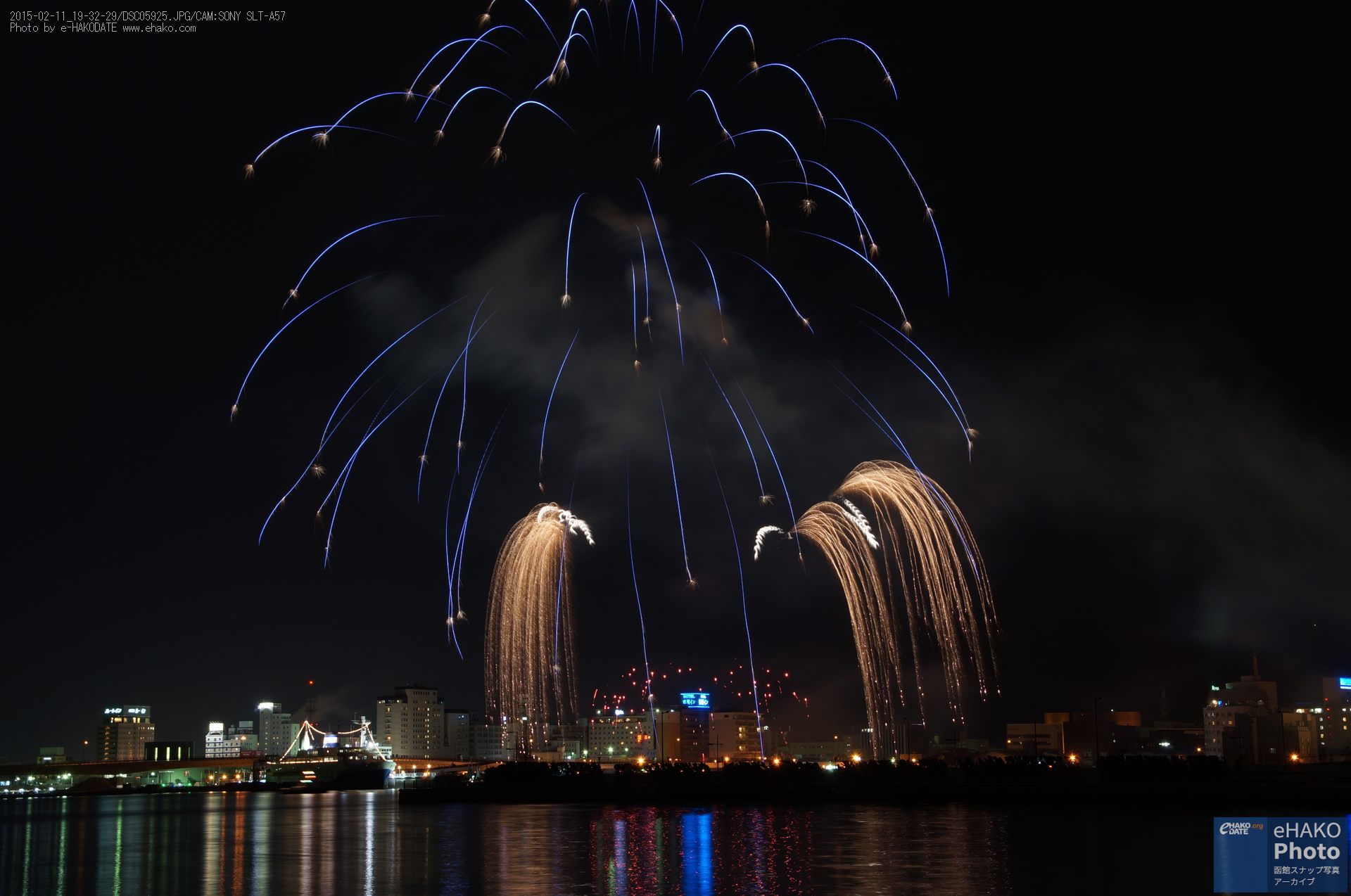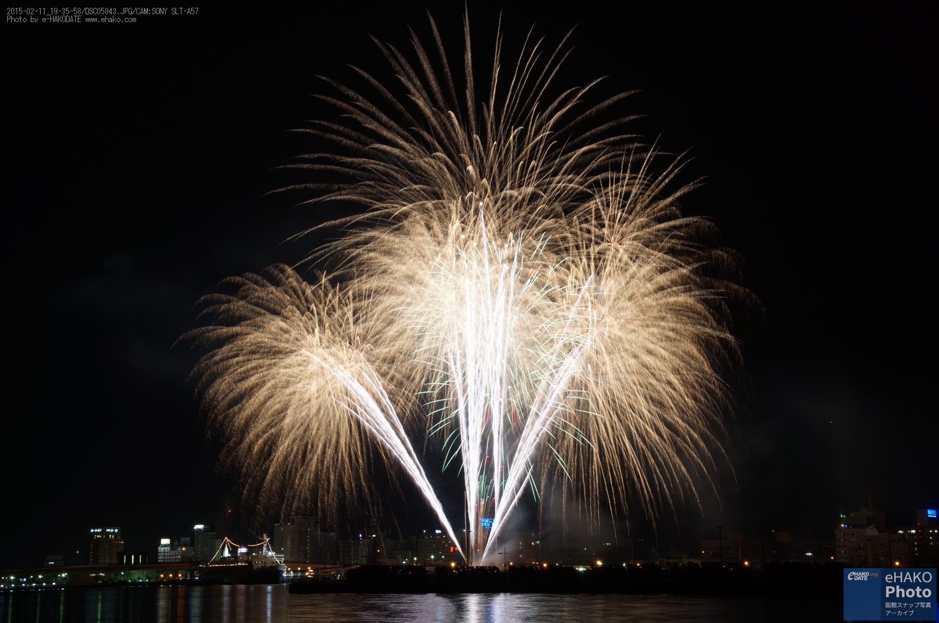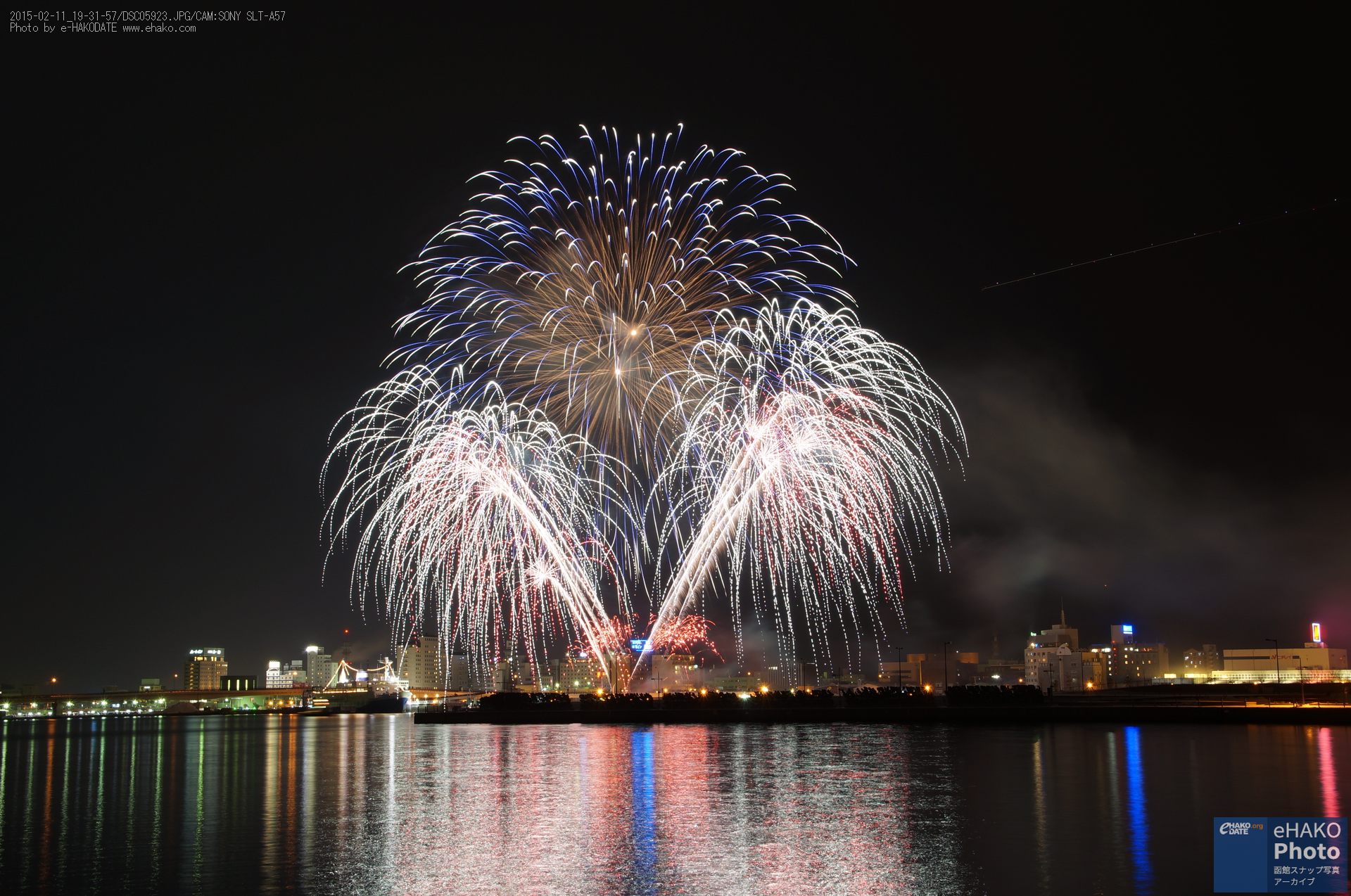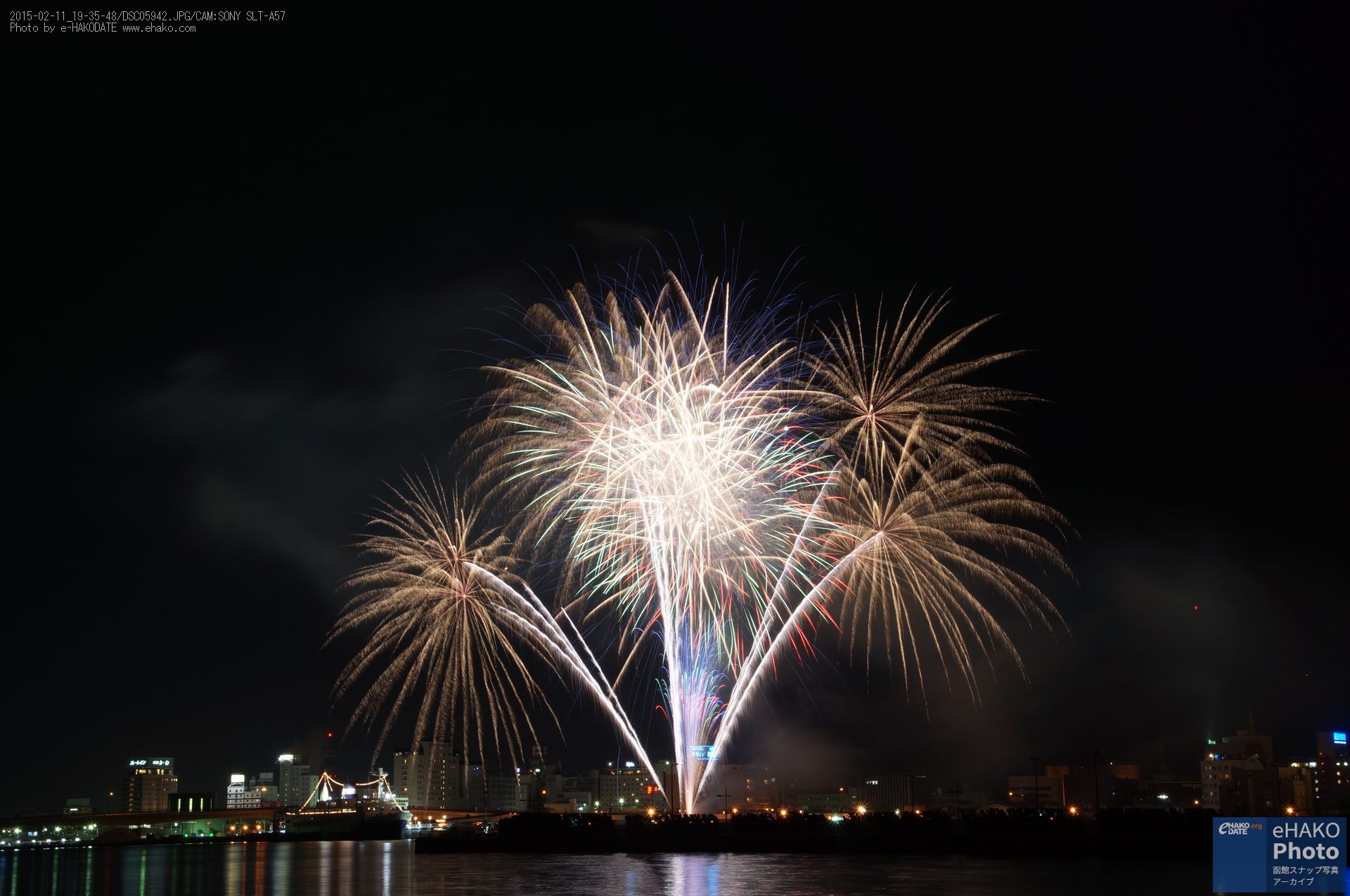 函館海上冬花火2015 2/11撮影 その2 2015年2月11日19:30頃から撮影。 函館海上冬花火2015の1日目に撮影した写真その2。撮影写真その1はこちら。 撮影場所は西埠頭そばなので、摩周丸を左に緑の島の向こうから打ち上がる感じです。 函館フォト散歩ブログの掲載記事はこちら。 FacebookXBlueskyHatenaCopy