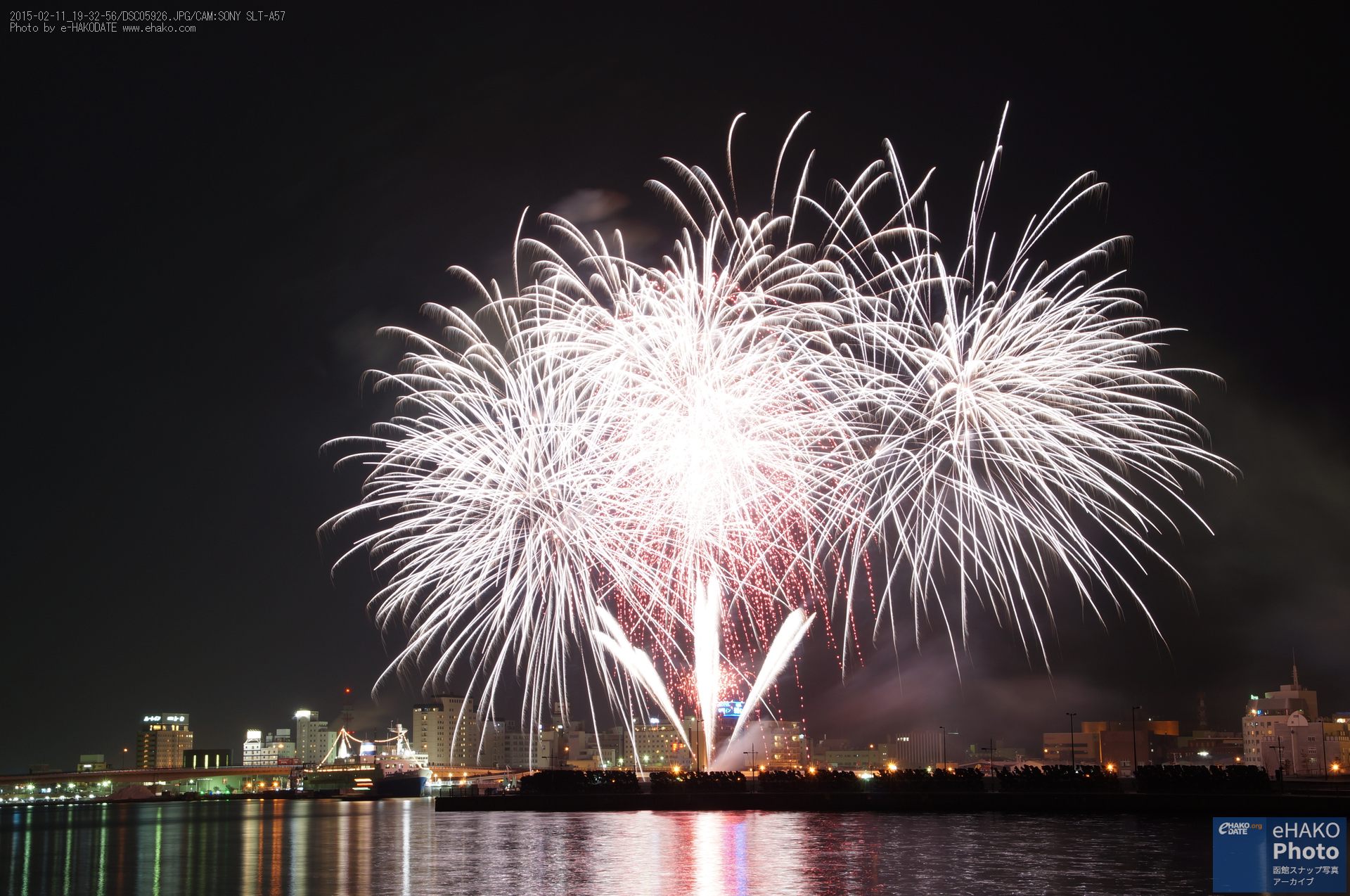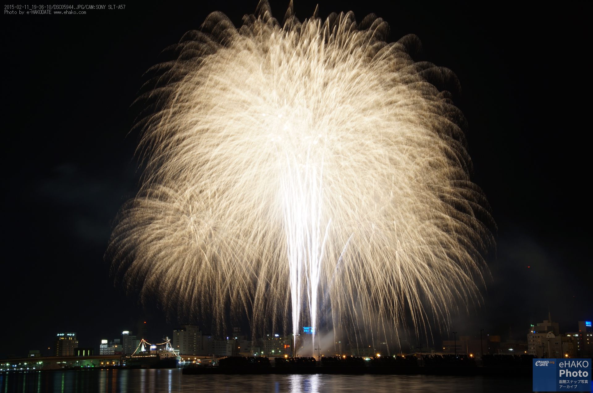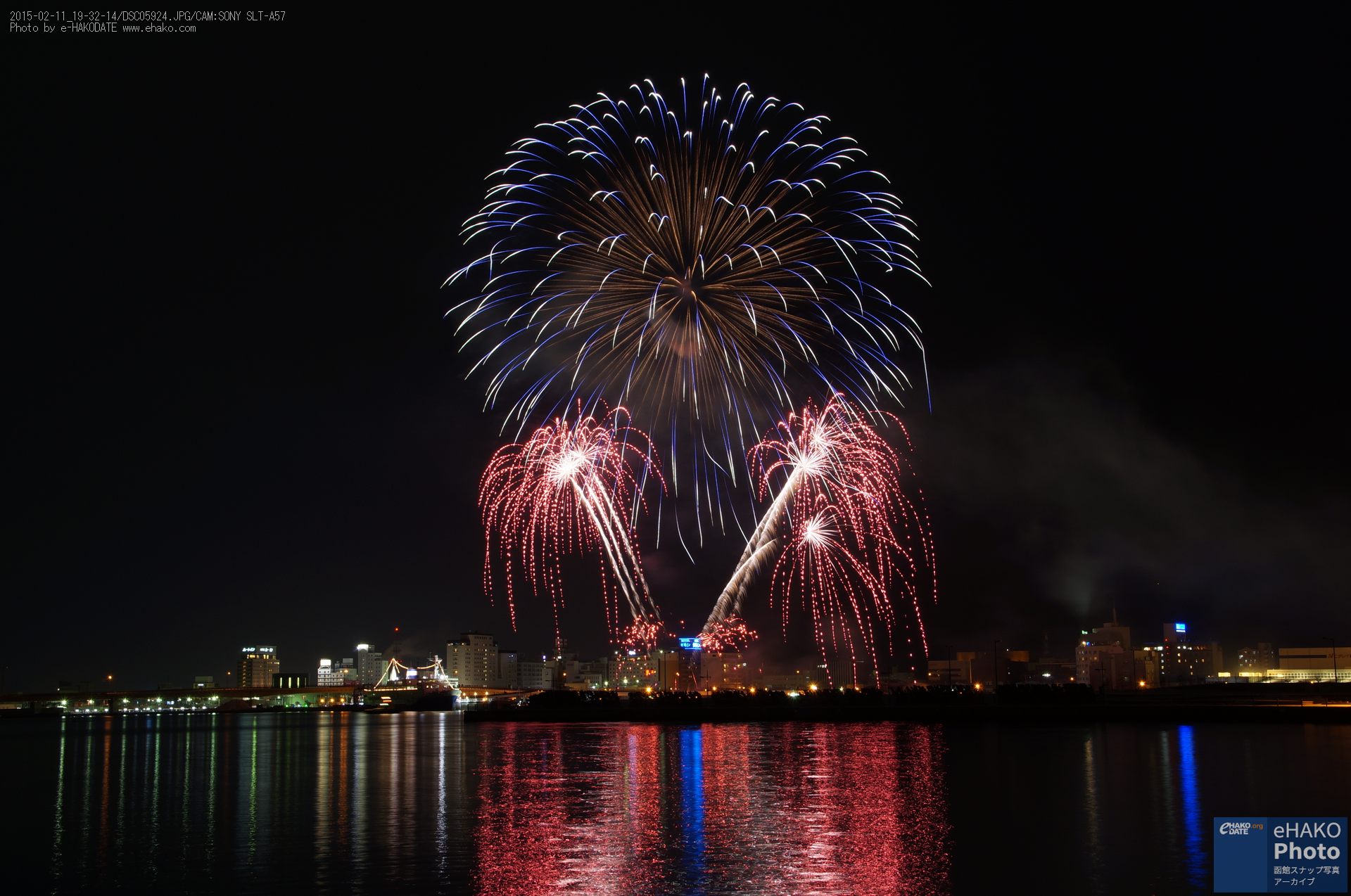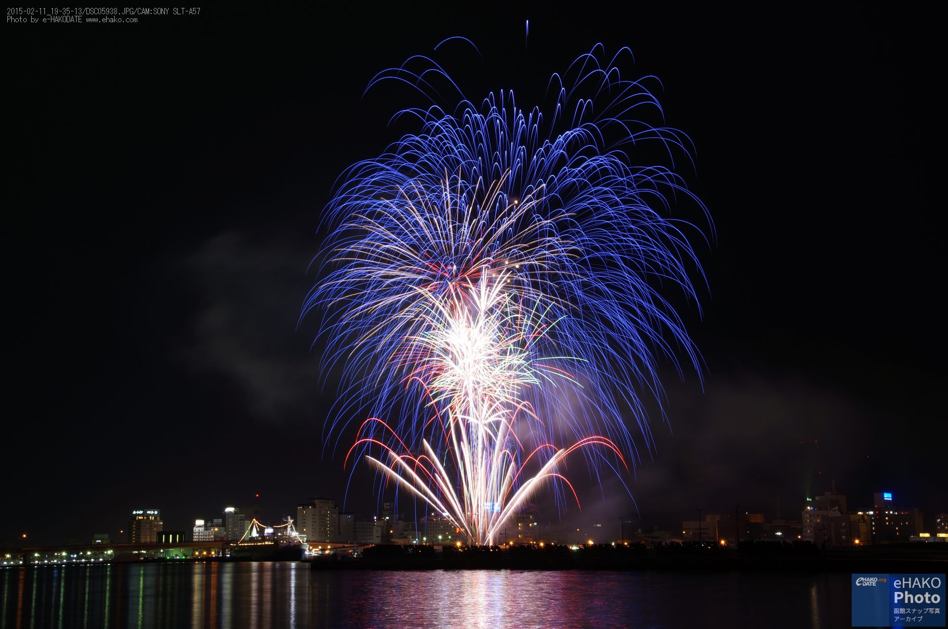 函館海上冬花火2015 2/11撮影 その2 2015年2月11日19:30頃から撮影。 函館海上冬花火2015の1日目に撮影した写真その2。撮影写真その1はこちら。 撮影場所は西埠頭そばなので、摩周丸を左に緑の島の向こうから打ち上がる感じです。 函館フォト散歩ブログの掲載記事はこちら。 FacebookXBlueskyHatenaCopy